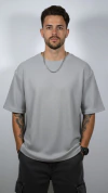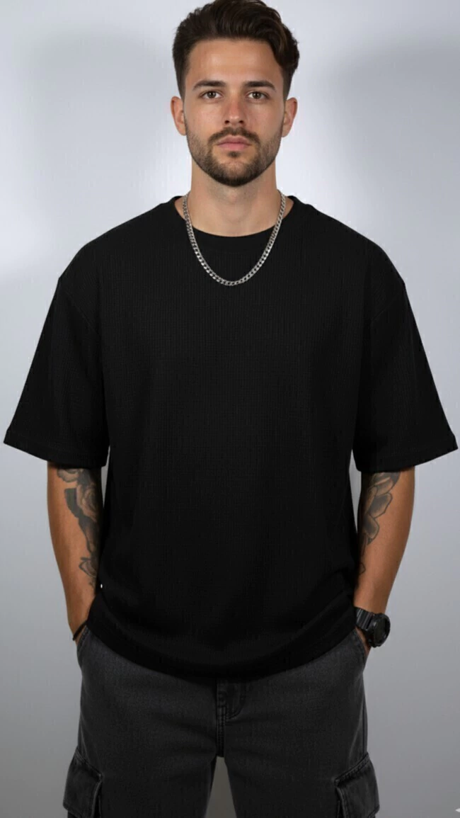 Remera Oversize manga corta confeccionada en tejido waffle, un material 100% algodón que se destaca por su textura acanalada y su gran suavidad al tacto. Su diseño oversize aporta un ajuste relajado y moderno, ideal para quienes buscan comodidad sin perder estilo en su día a día.